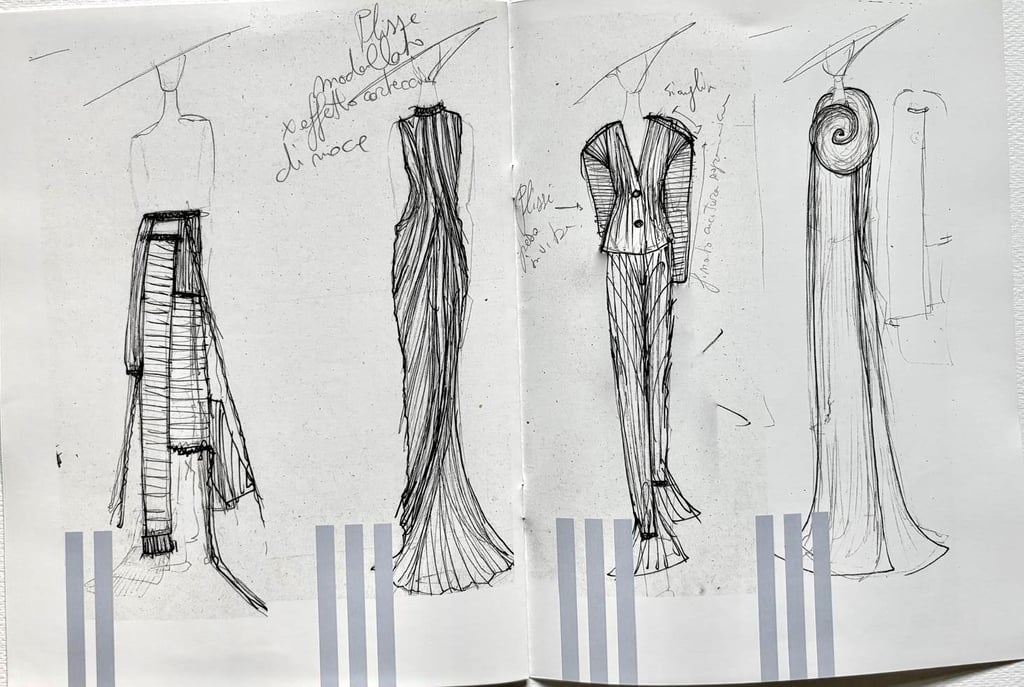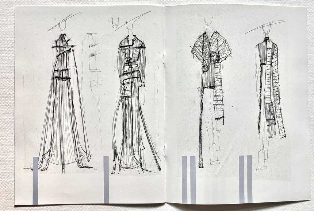 In this philosophy, the soul travels through multiple lives until it reunites with the spiritual center of the universe: OIW. Similarly, the collection evolves, and the pleating, which binds all the pieces, undergoes various experiments—first irregular, grunge, and decadent, then pinned, refined, and supported.